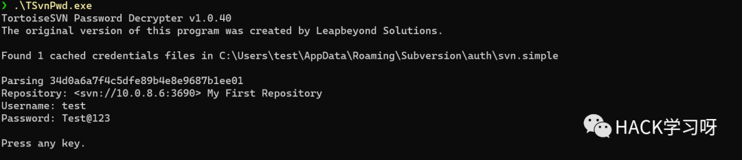 %APPDATA%\Roaming\Subversion\auth\svn.simple\我们可工具以使用TSvnPwd来解密。工具下载地址:http://www.leapbeyond.com/ric/TSvnPD/