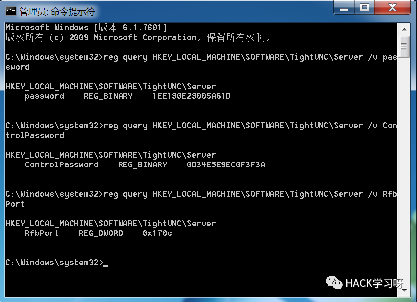 TightVNC的加密后密码存在注册表里内,注意查询需要管理员权限。