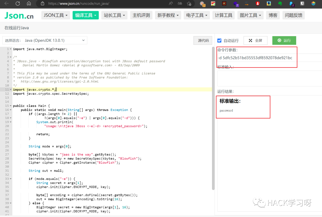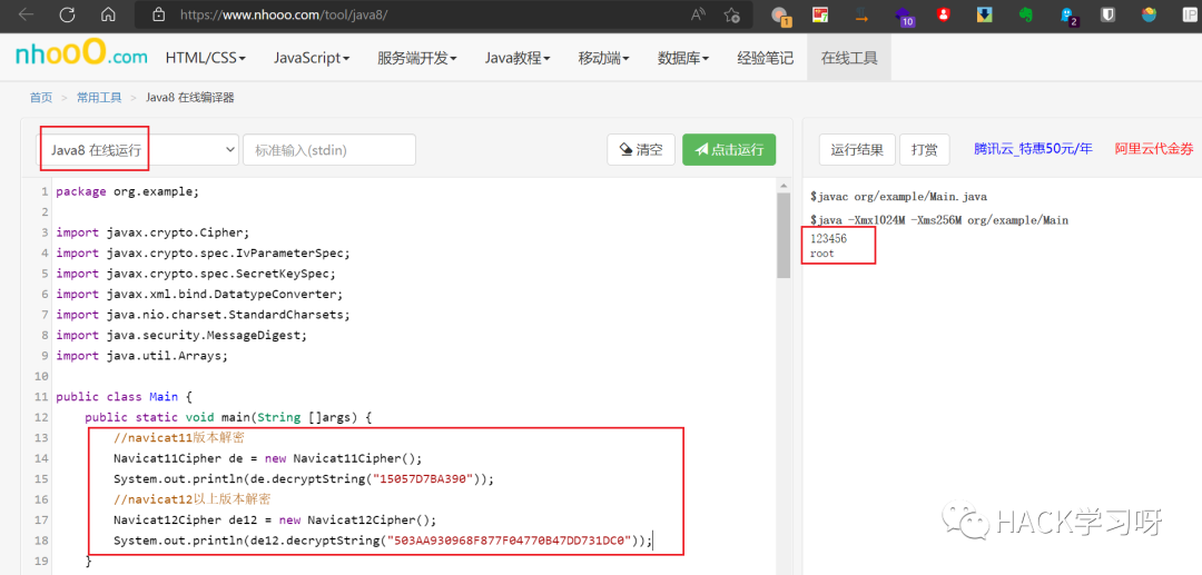 reg query HKEY_CURRENT_USER\Software\PremiumSoft\ /s /v pwd然后可以使用以下代码在线解密,注意Navicat版本:在线运行地址:https://www.nhooo.com/tool/java8/