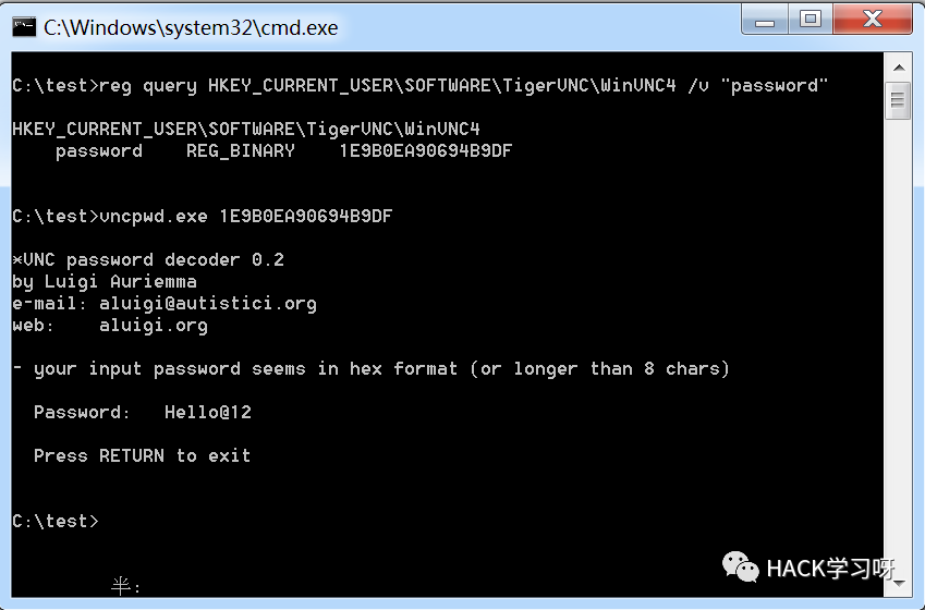 RealVNC别名WinVNC,RealVNC的加密后密码存在注册表里内,注意查询需要管理员权限。