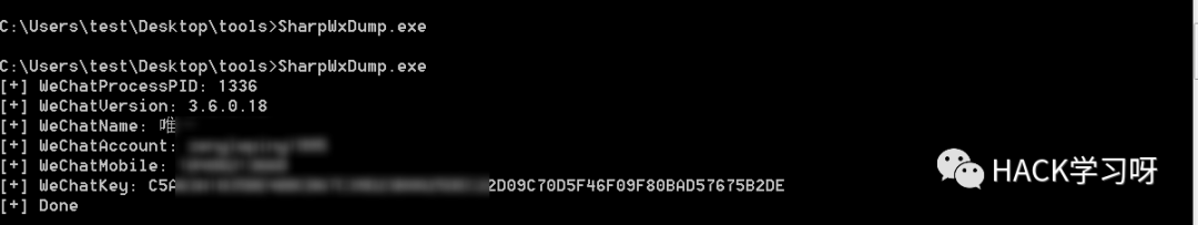 我们可以使用工具SharpWxDump[3]来获取解密密钥,使用该工具需要注意两点,一是编译工具选择x86架构,而是对方微信必须是在登录状态。