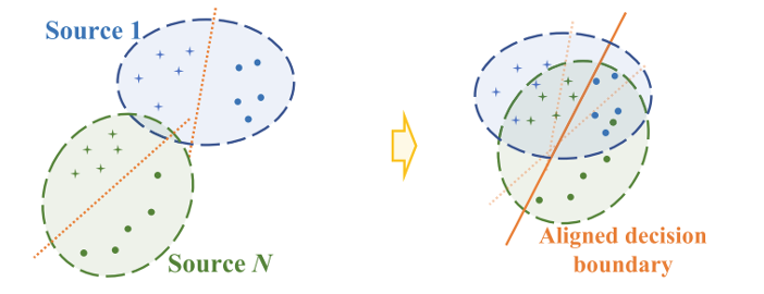4)特定域回归适应:缩小目标表示和每个源表示之间的分布差距,但它并没有直接有效地缩小源域之间的决策差异。因此,目标域样本通过不同域特定路径(提取器和回归器)的输出可能会有很大差异,即决策边界不重合。如图3所示,即使在两个源域之间的分布距离显着减小后,它们各自的决策边界仍然存在显着差异。因此,需要一种有效的策略来产生一致的决策边界,以弥合特定领域回归器之间的差距。