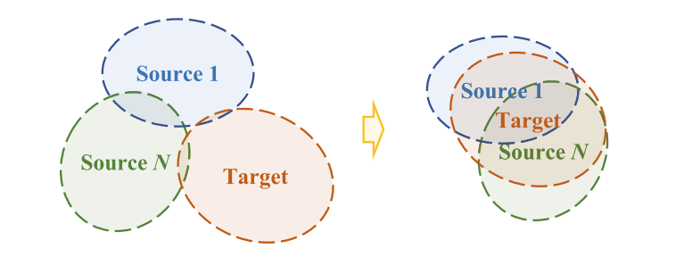 本文考虑MDA的以下问题。给定N个不同的标记源域数据集和一个未标记的目标域数据集Xt,其中Xsj包含nsj个输入服从分布psj,并且Ysj表示对应的ground truth set。此外,目标数据集Xt服从分布pt是在没有标签观察Yt的情况下采样的。将这些N+1个数据集视为训练集集合,MDA旨在学习预测函数f*以最小化测试数据集的预期风险目标分布pt,即