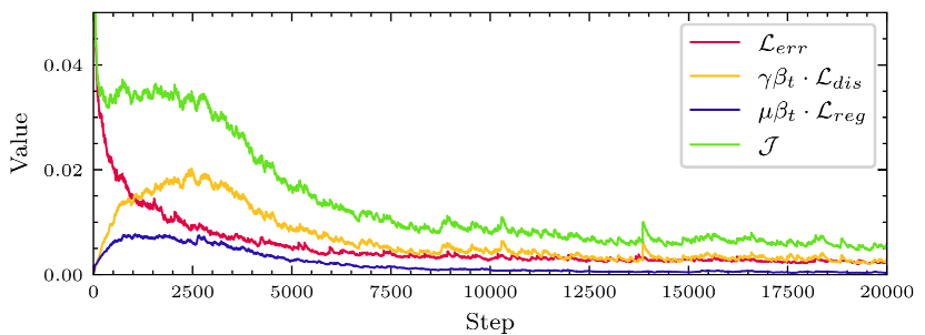 目标函数各分量的训练曲线如图5所示。注意,与epoch平均误差不同,单步误差非常不稳定,因此图中的曲线已经过滑动平均,以清楚地反映趋势。从图5可以看出,随着迭代的进行,回归误差Lerr迅速减小,而Ldis和Lreg最初由于βt的增加而增加了它们的贡献。随后,随着训练的继续,每个误差项不断下降。最终,总误差J趋于平稳。回归误差、域差异和回归距离都趋于优化。