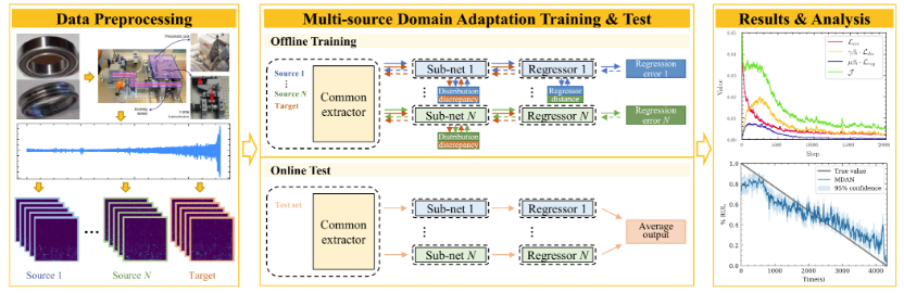 本文提出了一种用于回归任务的多源域适应网络(MDAN)。MDAN从多个来源学习域不变特征和监督,并在目标域中提供比传统SDA方法更好的泛化。此外,提出了一种新的基于MDAN的框架,用于在多种运行条件下预测轴承的剩余使用寿命。具体来说,本文将振动信号的时频表示输入到MDAN中,以实现跨操作条件的端到端训练和推理。