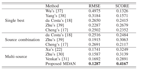 4)提出的MDAN方法在多源RUL预测任务上获得了最好的预测结果,验证了其有效性和优越性。