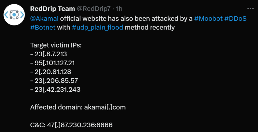 但最近奇安信威胁情报中心监测到 Akamai 自己的官方网站( akamai.com )频繁遭受来Mirai 和 Moobot 家僵尸网络的猛烈攻击。随后,我们第一时间向安全社区发布预警,希望引起国内外安全研究人员对此事件进一步探索与交流: