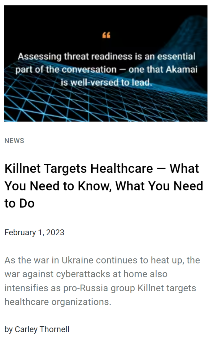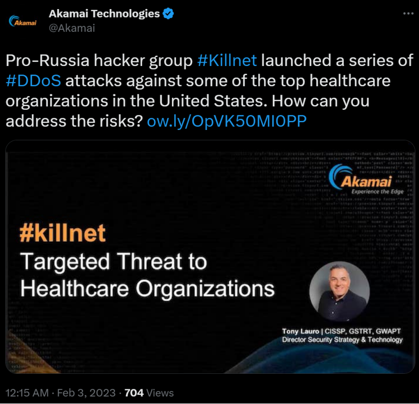 我们发现 Akamai 官方推特这两天连发两贴关于俄乌战争的分析,重点关注俄方阵营网络攻击组织 Killnet 针对医疗行业的攻击活动: