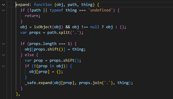 但是题目过滤了 __proto__ 源码,一般情况下直接用 constructor 和 prototype 组合 {"constructor": {"prototype": {"whoami": "Vulnerable"}}} 就能绕过了,但是这里不行。跟进 safeobj.expand() 的源码一探究竟: