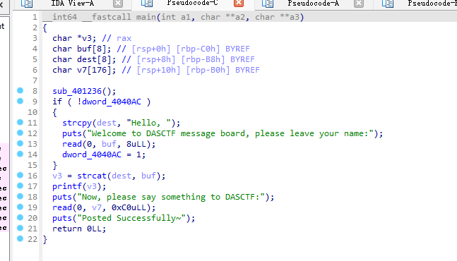 sla('Welcome to DASCTF message board, please leave your name:\n','%p')