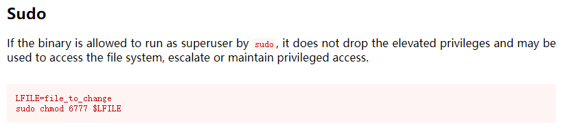 在gtfobins上搜到chmod的sudo提权方法: