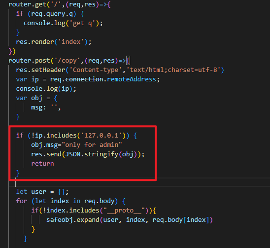 此外,题目还是用了 ejs 模板引擎,那么我们很容易想到原型链污染+ejs构造RCE,但是触发原型链污染的/copy路由必须从127.0.0.1本地访问,需要进行ssrf: