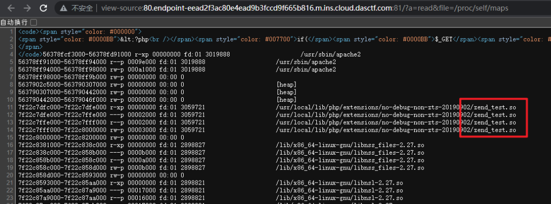 应该是对php源码进行了加密。读取 /proc/self/maps 查看当前进程的内存映射关系,发现加载了一个名为zend_test的扩展,如下图所示。