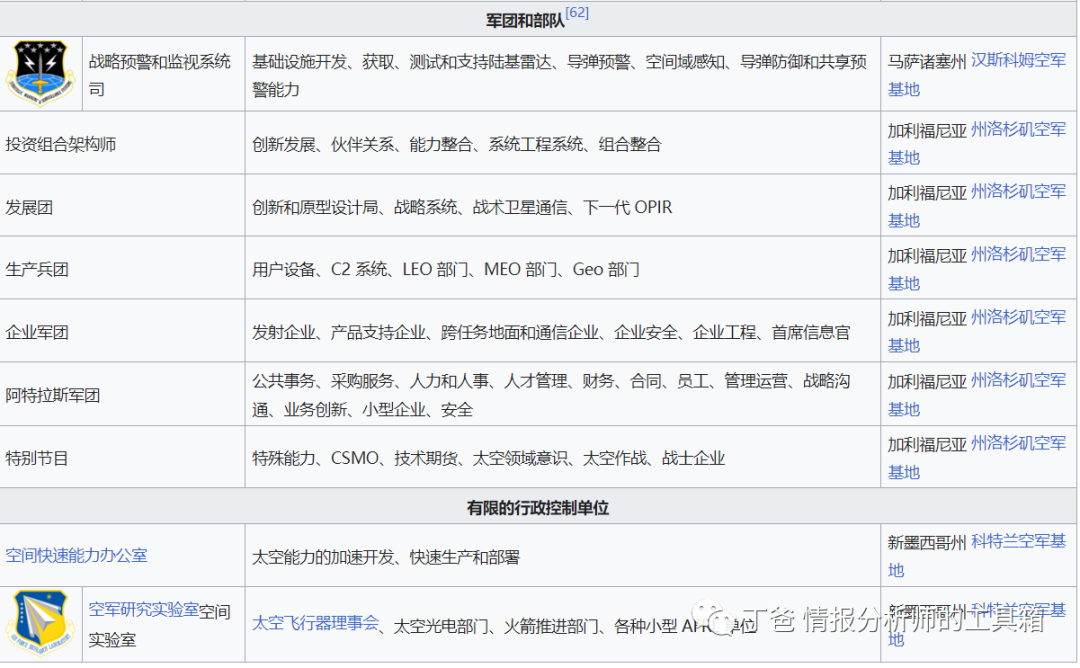 2019 年 12 月 20 日约有 16000 名军事和文职太空人员被分配到太空部队,其中军事人员8400 名,太空部队是美国最小的武装部队。下辖三个野战司令部:太空作战司令部 (SPOC)、太空系统司令部(SSC)、太空训练和战备司令部 (STARCOM)。分布在帕特里克、巴克利、彼得森、施里弗、洛杉矶、范登堡等空军基地。