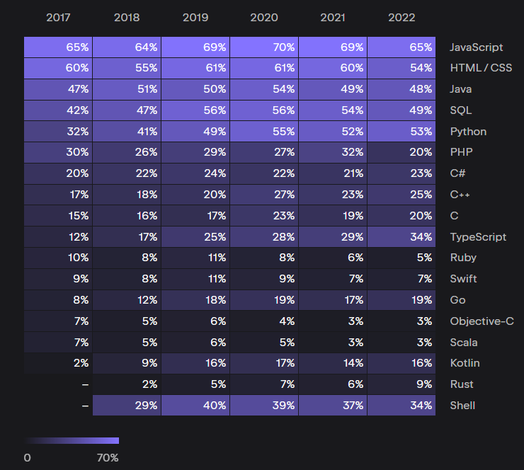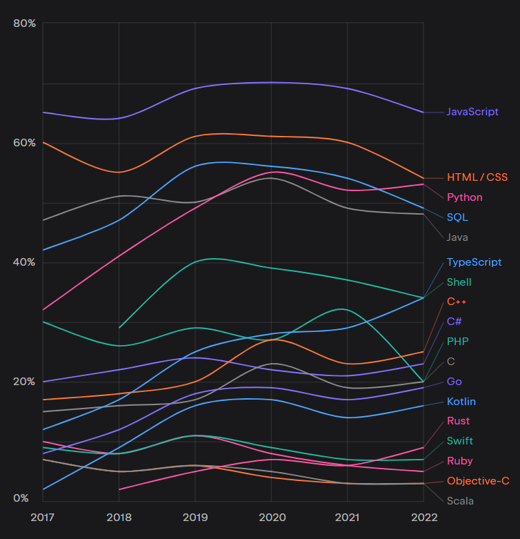 TypeScript 是增长最快的编程语言。Python 作为第二流行的编程语言地位继续巩固,占有 55% 的份额。作为一种主要语言,它的表现超过了 Java,并缩小了与 JavaScript 的差距。