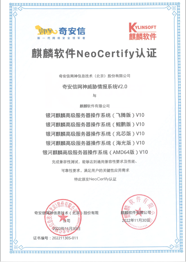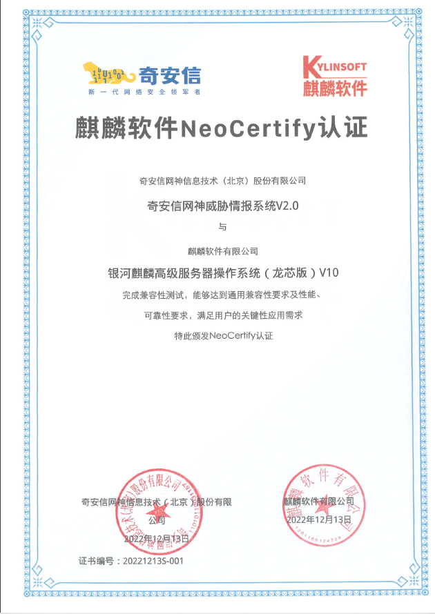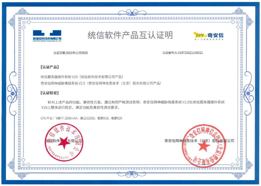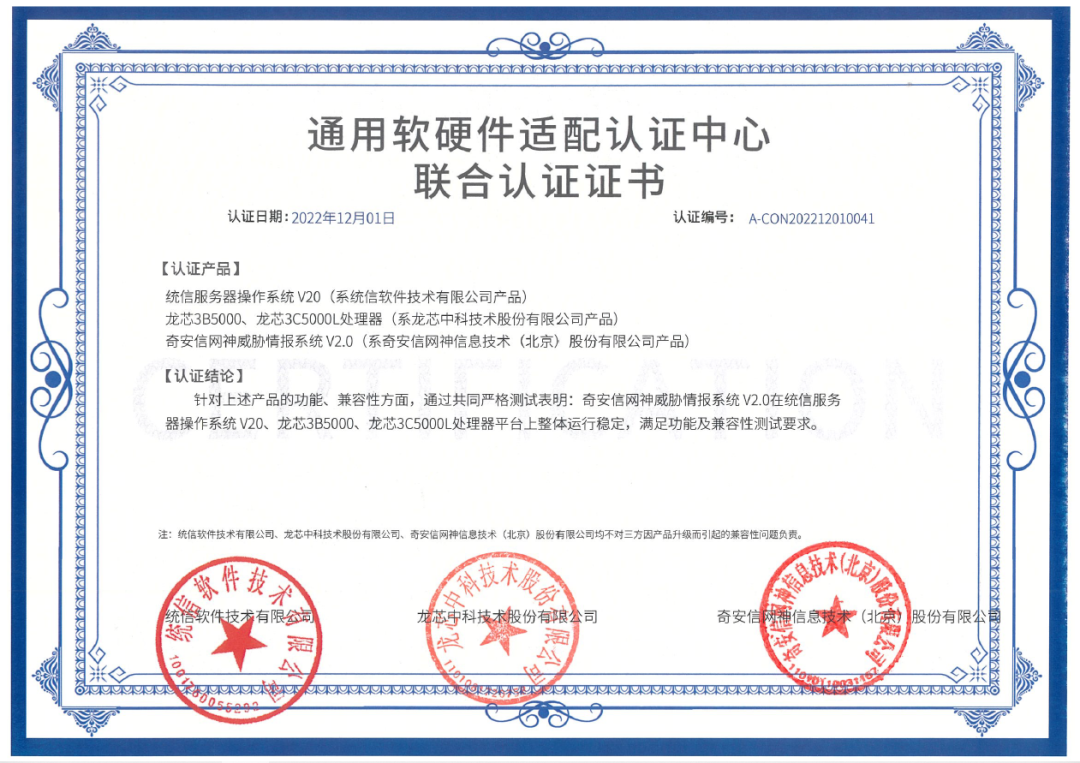 截至目前,奇安信威胁情报平台TIP已适配统信UOS、麒麟等国产化操作系统,同时也通过了兆芯、龙芯、海光等国产化CPU的兼容性测试并取得了互认证明。