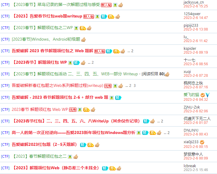 【2023】解题领红包Web(静态差三个未找全) 吾爱破解2023红包题(2~5天题解) 高一人的第一次正经逆向——吾爱2023新年领红包Windows题分析 【2023春节红包】二、三、四、五、六、八WriteUp(其余仅作记录) 2023春节 解题领红包 Web WP 吾爱破解 - 2023 春节解题领红包 2-6 + 部分 web 题 吾爱破解新春红包题之Web系列解题过程(writeup) 【2023春节】解题领红包 WP 吾爱破解 2023 春节解题领红包之 Web 题解 【2023】吾爱春节红包web题writeup [2023春节]Windows、Android初级题 【2023春节】解题领红包活动 二、三、四、五、WEB一部分 Writeup 【2023春节】菜鸟记录的第一次解题过程与感受 【2023春节】解题领红包之二WP 【2023】春节解题领红包之二