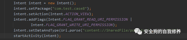 添加包名、隐式启动需要action进行匹配,不设置category系统会默认增加”android.intent.category.DEFAULT”,addFlags增加临时读写权限,在Intent中要同时设置Data和Type属性就只能调用setDataAndType函数,如果是单独setData、setType会互相抵消。