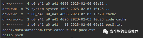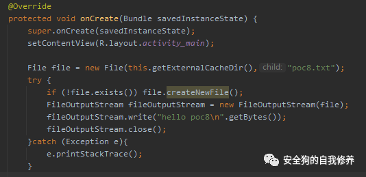 这里读取创建好的poc8.txt文件。文件是在poc8启动时创建,写入”hello poc8”字符串。创建路径为:“/storage/emulated/0/Android/data/com.test.poc8/cache/poc8.txt”