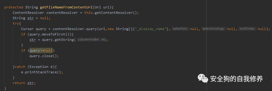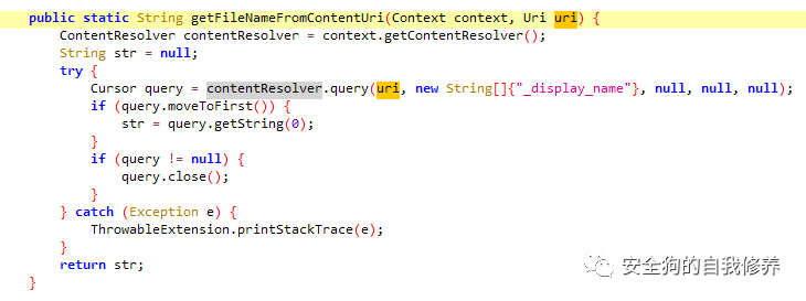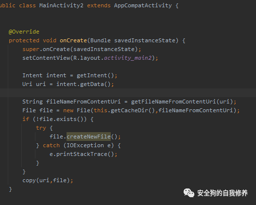 配置好隐式调用后,MainActivity2组件实现接收外部传入的Intent,并将intent中的uri提取出来使用。模拟Firefox 的逻辑,Firefox使用接收的uri调用query获取文件名,代码如下: