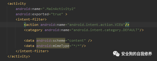 为了方便区分,这里创建一个名为 MainActivity2的组件,要满足隐式调用和MIME需要增加intent-filter标签和data数据标签。如下: