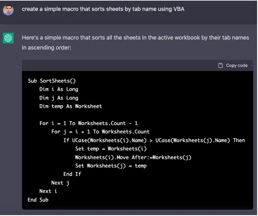 在这种情况下,ChatGPT没有做对。代码在 VBA 中引发错误。我不是 VBA 专家,所以我向 ChatGPT 描述了错误,它调试了代码。