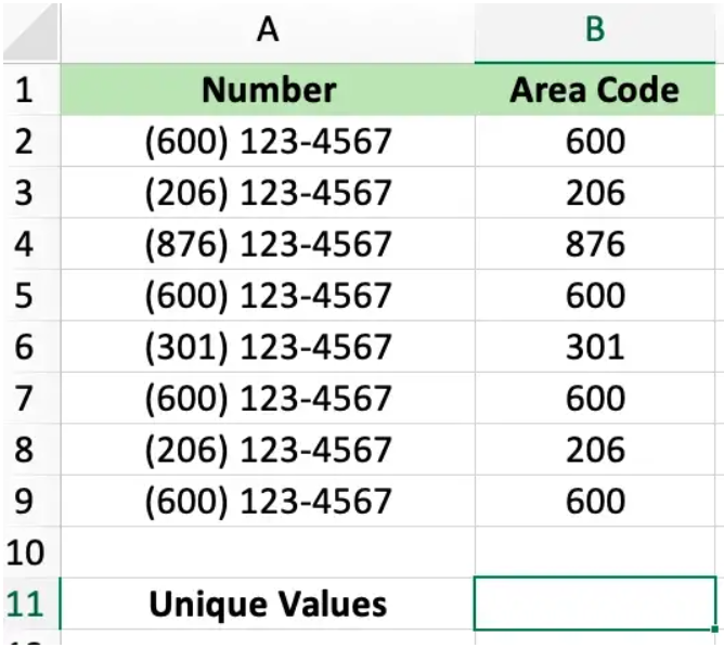 现在让我们计算一下 B 列中有多少个唯一区号。