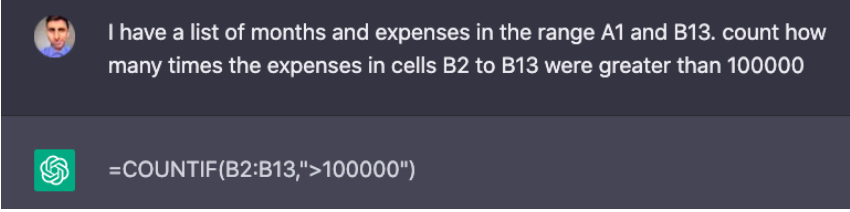如果现在我们想计算每月支出超过 100,0000 美元的次数怎么办?同样,我们只需要向 ChatGPT 描述我们的问题,但这一次,我们将添加更多详细信息。