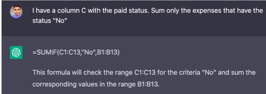 假设我们完全不熟悉 Excel,并且不知道如何对“费用”列中的值求和。好吧,我们只需要用简单的英语向 ChatGPT 解释我们想做什么。