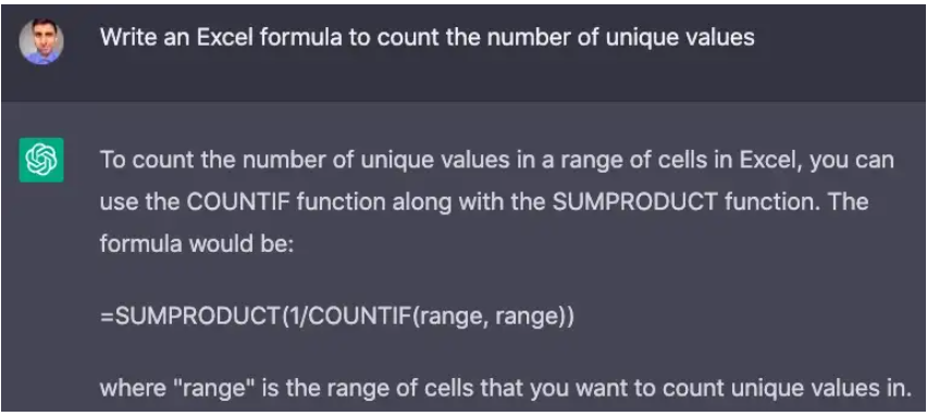 =SUMPRODUCT(1/COUNTIF(B2:B9, B2:B9))使用 ChatGPT 创建宏
