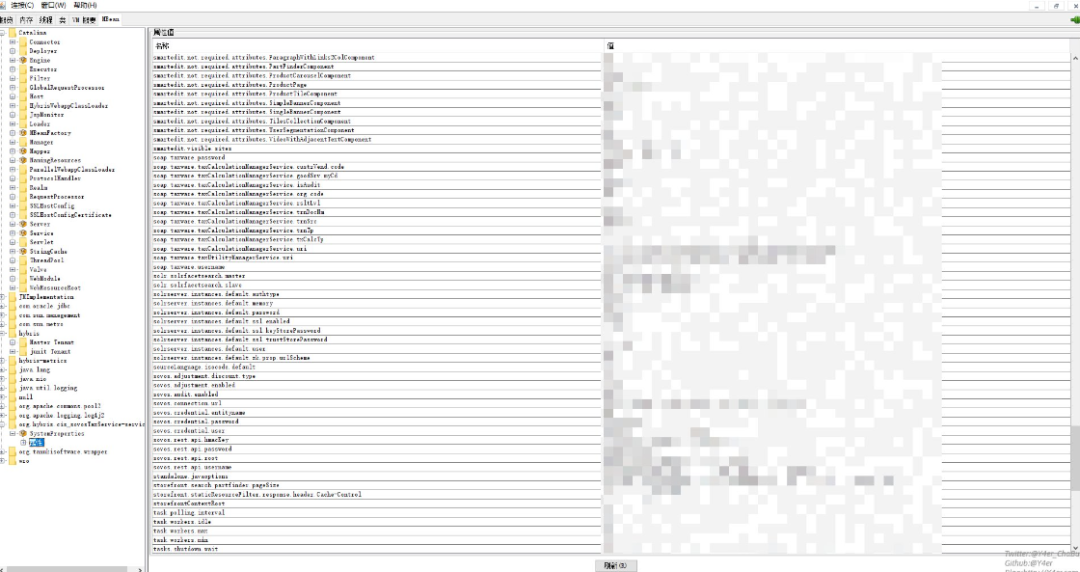 service:jmx:rmi:///jndi/rmi://1.1.1.157:9003/jmxrmi jconsole连上去之后发现一些敏感的账号密码