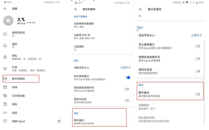 以Signal为例,手机App自带备份功能,能够直接将数据包备份至本地,然后对备份的数据包进行解析、查看。