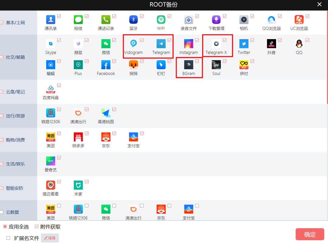 ROOT权限是系统权限的一种,获得ROOT权限之后就意味着已经获得了系统的最高权限,可以对系统中的任何文件(包括系统文件)执行所有增、删、改、查等操作。因此,如果能够获得手机的ROOT权限,那么就能对手机里的小众社交APP进行获取,这种方法常常受限于如何获取ROOT权限。以Telegram衍生系列应用Telegram X为例,在手机提权的情况下,取证人员可以直接使用M6000-响尾雀极速取证系统,直接对数据进行提取解析。图 响尾雀ROOT备份界面