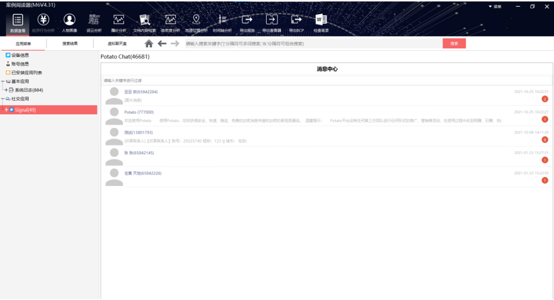 直接利用手机取证软件进行部分小众社交APP的数据提取是每次取证首先尝试的方法,但这种方法只能对少部分小众社交APP进行获取,而且往往与手机系统版本、手机型号等因素有关。以蝙蝠应用为例,取证人员可以直接使用M6000-响尾雀极速取证系统,通过有线连接手机的方式进行数据的提取解析。![]()