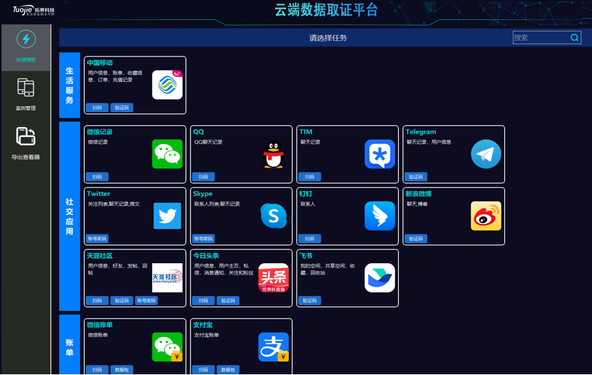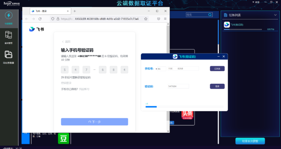 云端数据获取是提取应用APP云服务器中数据的一种方法。对于一些小众社交APP,其数据存储在云端服务器中,可以尝试用这种方法获取,如Telegram、飞书、Twitter等。以飞书应用为例,打开云端取证平台后,找到飞书应用,进行云端数据获取,待任务列表读取完毕,即可完成云端数据获取。
