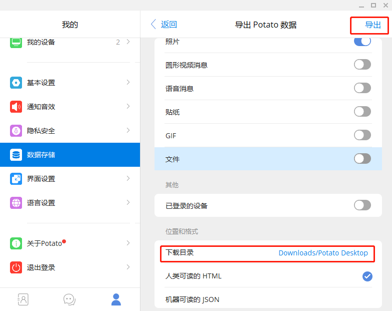 像Telegram、Potato等小众社交APP不但拥有手机端App,也有对应的主机端应用软件。主机端应用软件往往也具有数据备份功能,可以利用这一功能将数据备份后再解析和查看。对于Potato软件,可以在其主机应用端,选择数据存储、导出Potato数据设置中将相关数据进行导出。这里还支持导出不同的文件格式,既可以是可读的HTML格式,也可以是数据转移中机器可读的JSON格式。