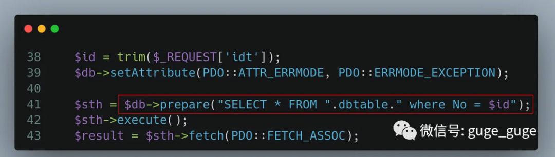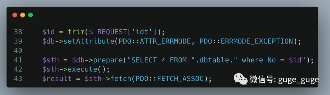 正如所看到的,开发人员通过“idt”参数获取用户输入,然后使用 prepare 语句将其传递给查询,这通常可以防止 SQL 注入。