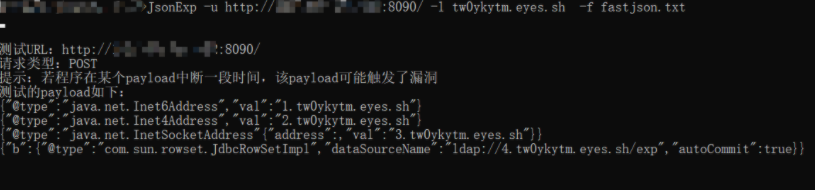 1、根据现有payload,检测目标是否存在fastjson漏洞(工具仅用于检测漏洞)