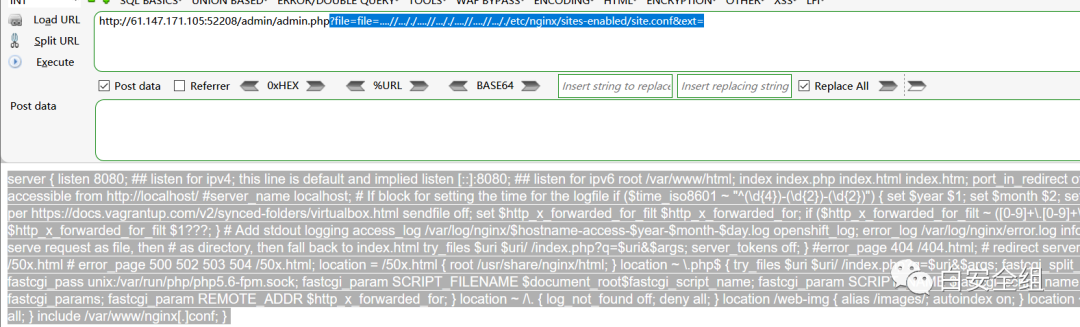 ?file=file=....//..././....//..././....//....//..././etc/passwd&ext=根据我们之前的线索,说nginx配置文件可能存在问题,那么我们去查看一下这个配置文件到底什么问题。