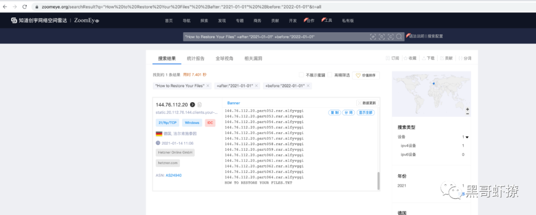 当然我发现还有一些比较有意思的情况,从ZoomEye的测绘情况来看,搜索"How to Restore Your Files"这个关键词居然还找到了2022年及2021年的数据,也就是这个可能不算是“最新”的,我们具体看看
