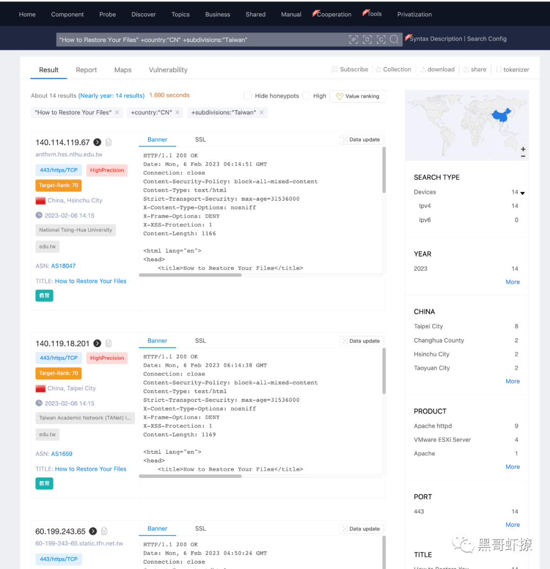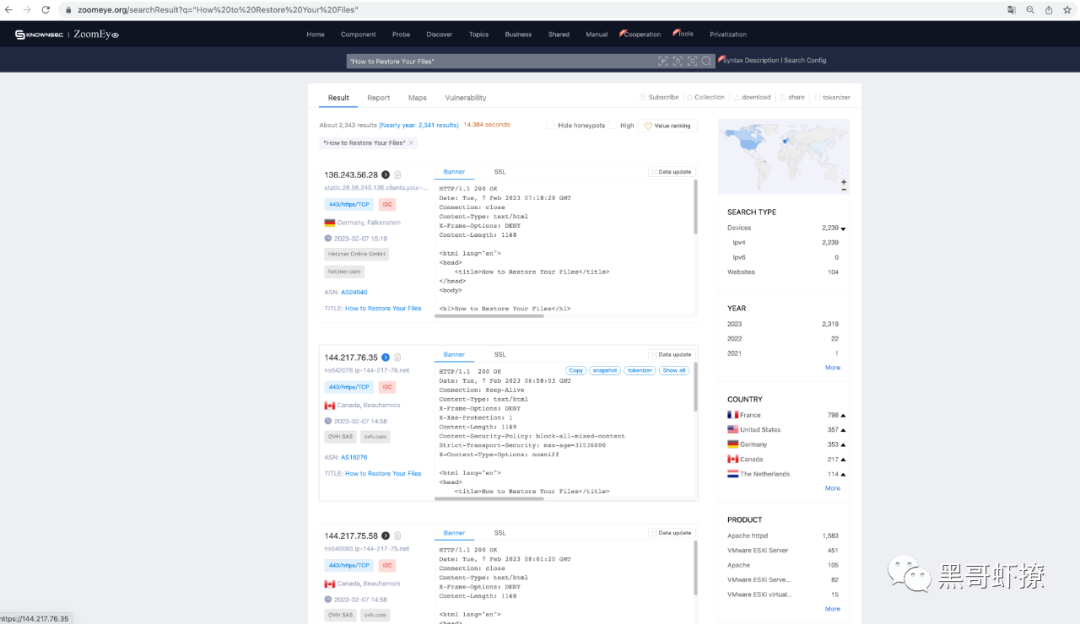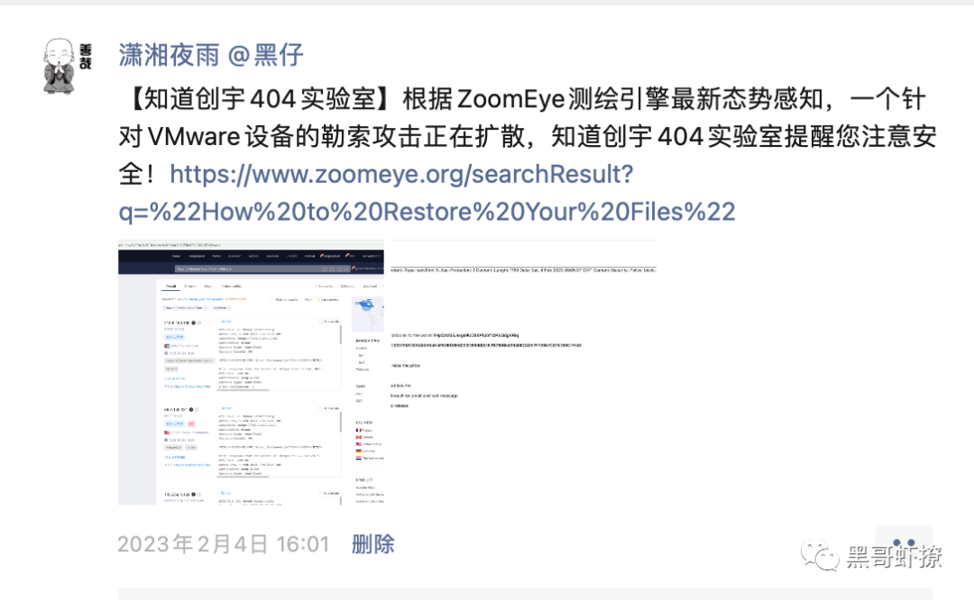 【知道创宇404实验室】根据ZoomEye测绘引擎最新态势感知,一个针对VMware设备的勒索攻击正在扩散,知道创宇404实验室提醒您注意安全!https://www.zoomeye.org/searchResult?q=%22How%20to%20Restore%20Your%20Files%22