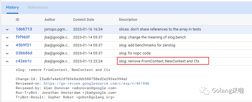 我很好奇作者为什么把这两个方法移除掉,后面翻到 slog 提案[1] 下面作者留言[2],大意是说这种使用方式有比较大的争议(主要是函数之间能否使用 context),而且如果使用者喜欢这种使用方式的话,也可以自己实现,所以把这两个方法移除了。